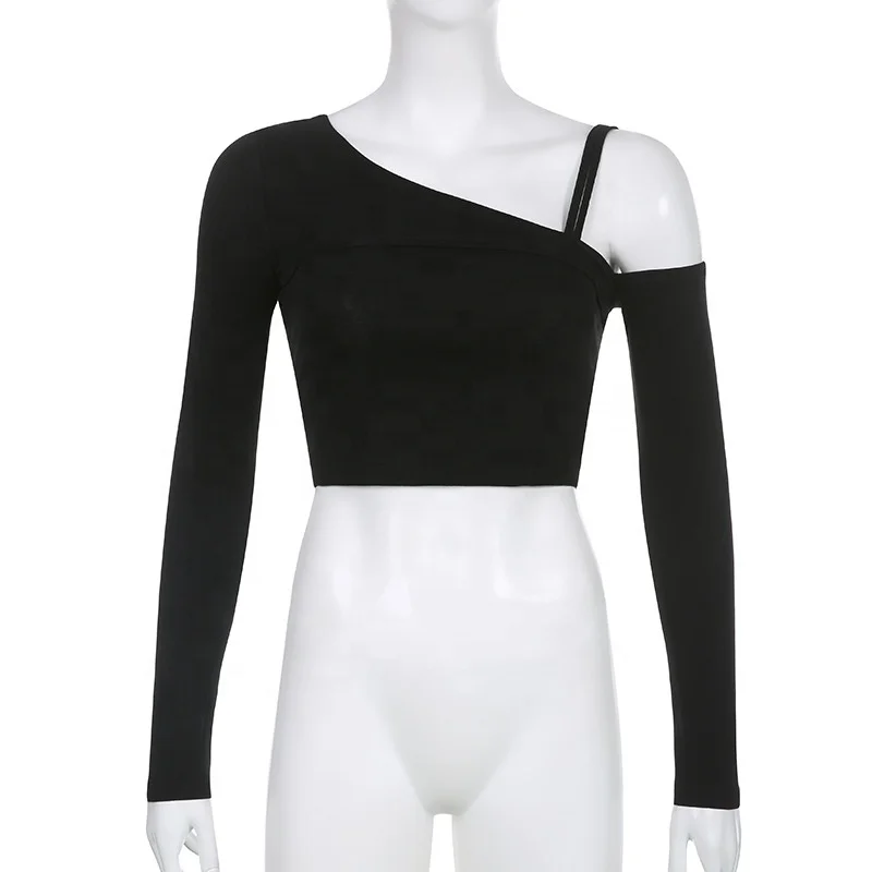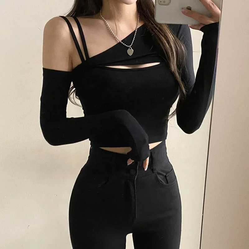 2 Piece T-shirt and Cami Crop Top Women Y2k Harajuku Long Sleeve Skew Collar Casual Basic Tight Tees Female Korean
