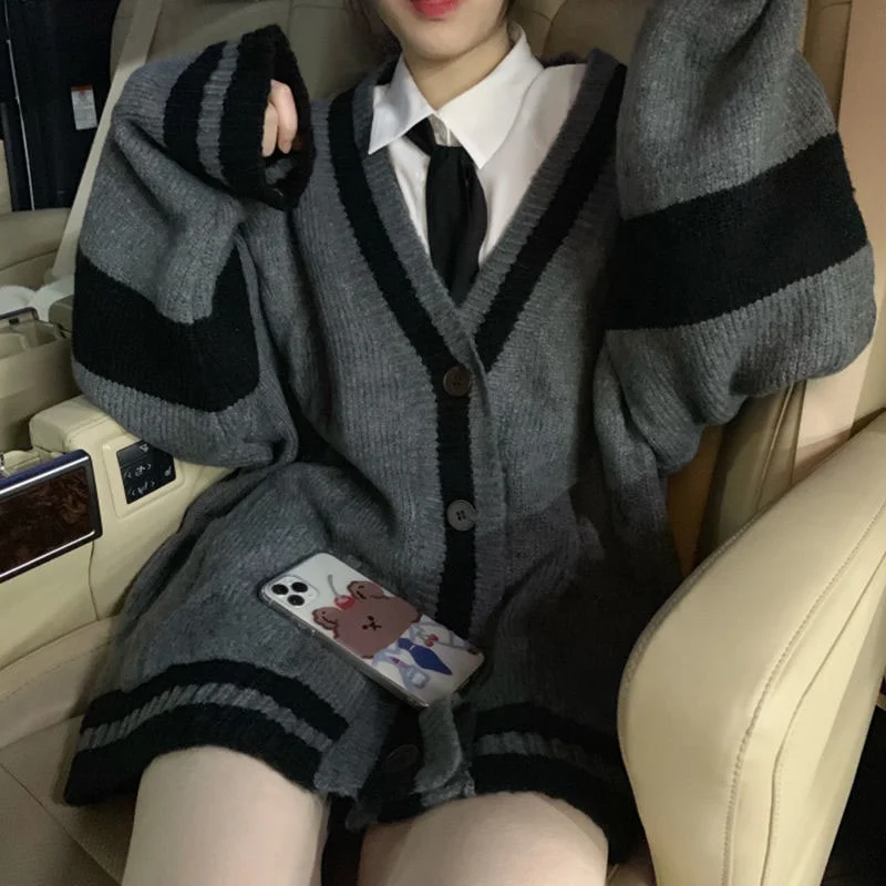 Deeptown Grey Striped Knitted Sweater Cardigan Women Korean Style Harajuku Oversize Jumper Preppy Fashion Female Tops Winter