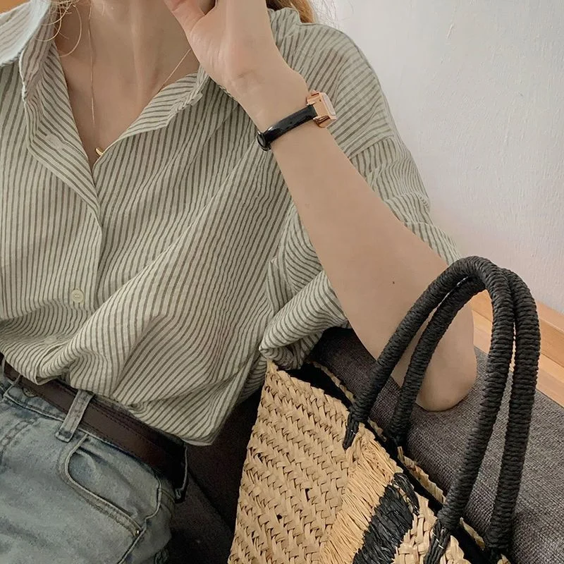 Elegant and Youth Woman Blouses Women’s Clothing Spring 2025 Green Vertical Stripe Shirt Short Sleeve Chiffon Blouse Woman