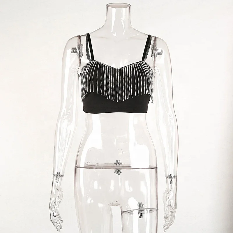 Fashion Sexy Clubwear Diamond Tassel Crop Tops Sleeveless T Shirts Sexy Slim Lady Bralette Tops Strap Skinny Female Tee