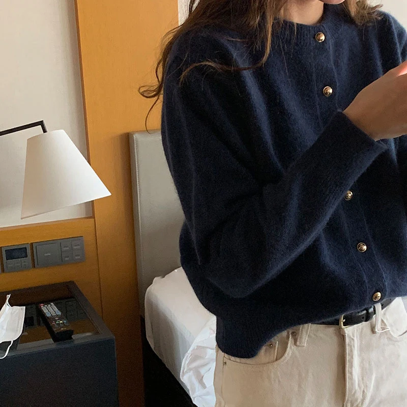 Knitted Cardigan Women 2025 New Korean Raccoon Cashmere Loose Solid Color Round Neck Sweater Coat Jacket Spring Autumn