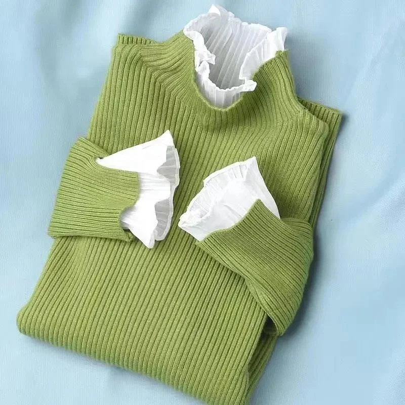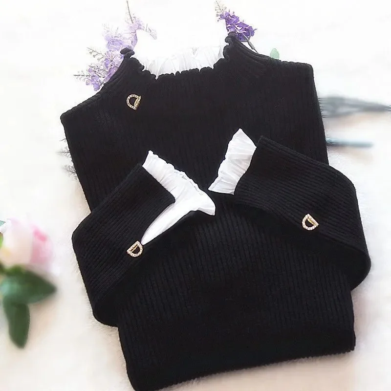 Korean Patchwork Warm Sweater Women Elegant Long Sleeve Slim Turtleneck Knitted Pink Tops Chic Ruffle Pullover Fake 2 Pieces