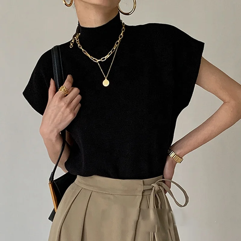 Shirt and Blouses Woman Stand-up Collar Knitted Vest Loose Elegant Tops Women Short Sleeve Office Lady Fashion 2025 Summer