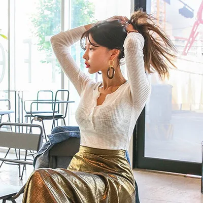 Spring Autumn Women Cotton T Shirt Long Sleeve White Tee Shirt Femme Female Slim Sexy Deep V Neck Tops Knitted Fashion Clothes
