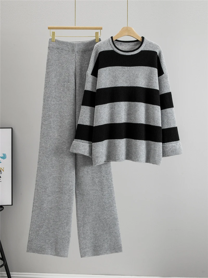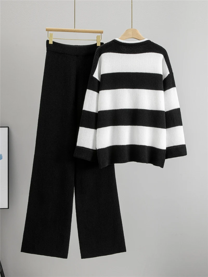 Spring Fall Chic Knitted 2 Piece Sets Korean Striped Sweater Cardigan Tops Conjuntos High Waist Wide Leg Pants Outfit New