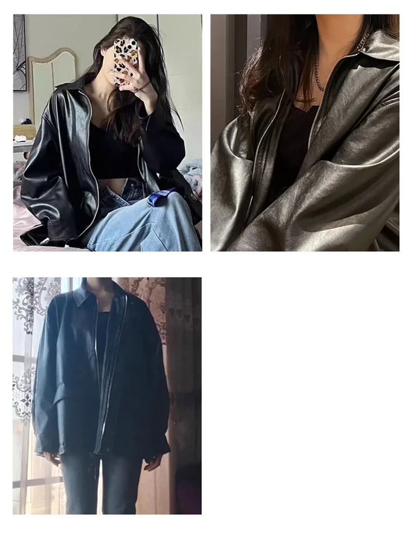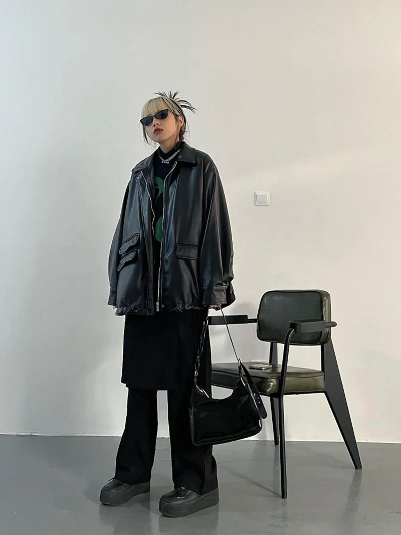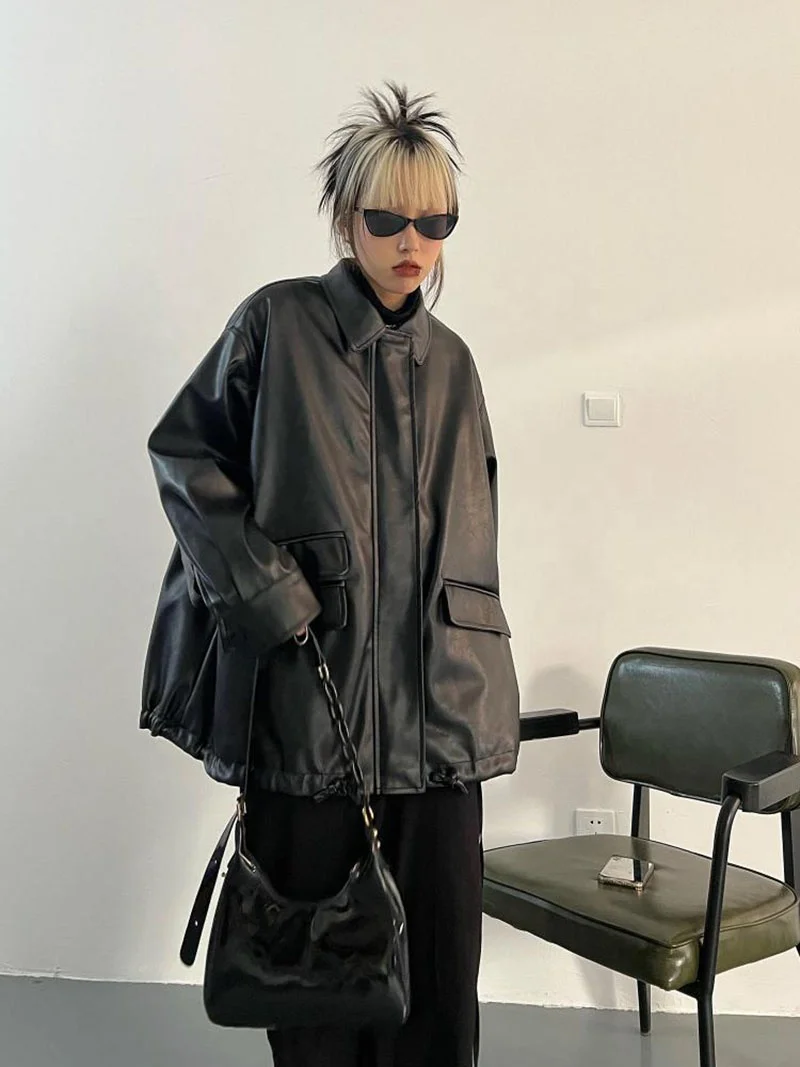 Streetwear Black PU Leather Coats and Jackets Women Pocket Long Sleeve Y2K Gothic Autumn Spring Ladies Jackets Outerwear