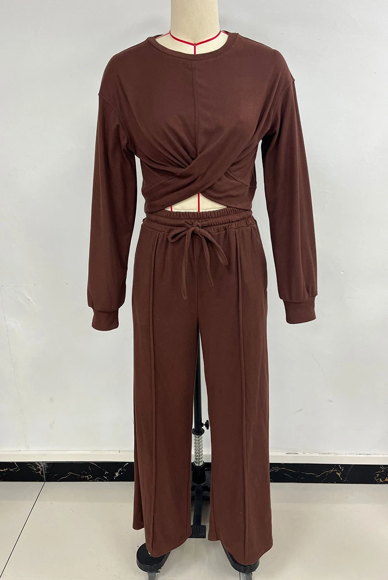 Women Two Piece Outfits Sweatsuit Set Casual Long Sleeve Twist Front Cropped Sweatshirt Wide Leg Sweat Pants