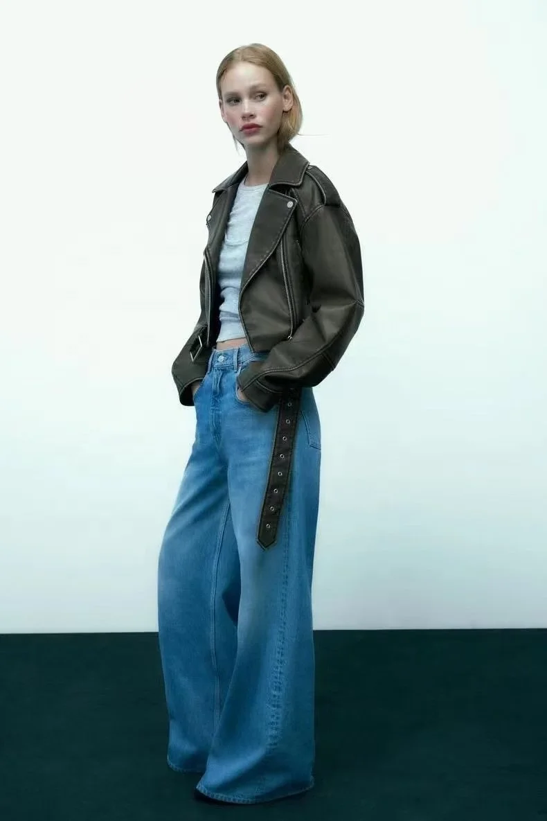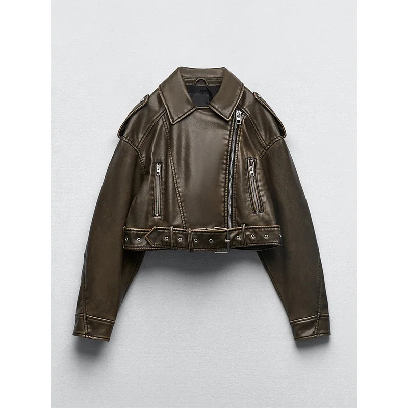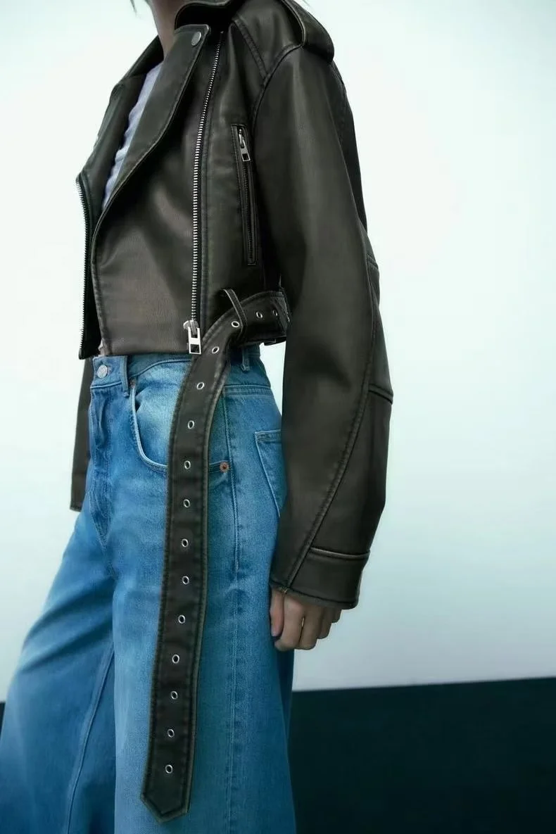 Women Vintage Loose Pu Faux Leather Short Jacket With Belt Streetwear Female Zipper Retro Moto Biker Coat Outwear Tops