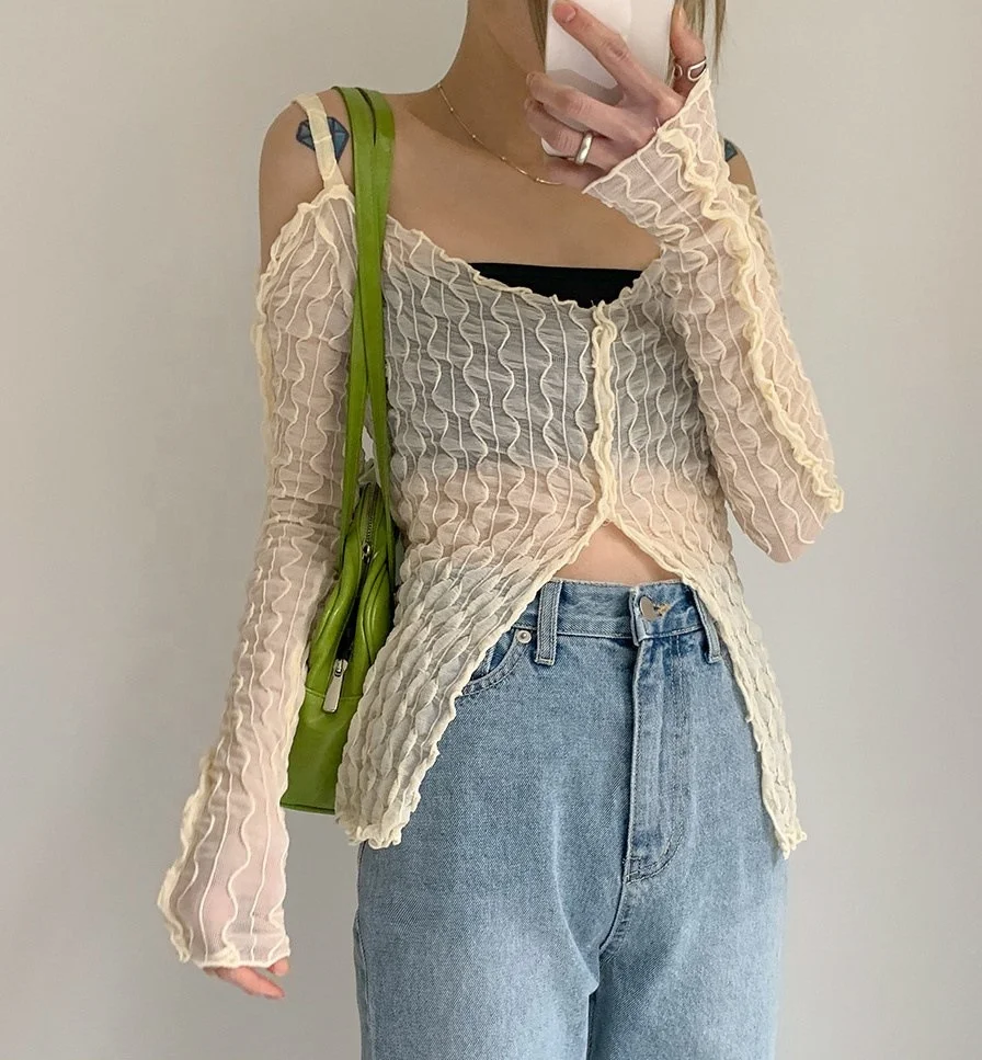 Y2K-Fairycore Aesthetics Open-Shoulder Zipper Slit Tops E-girl Fashion Sexy Wave Ruffles Long Sleeve T-shirt Transparent