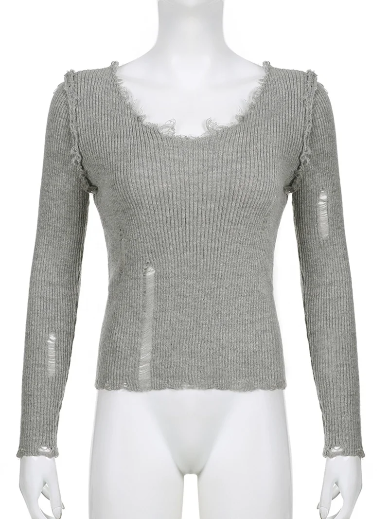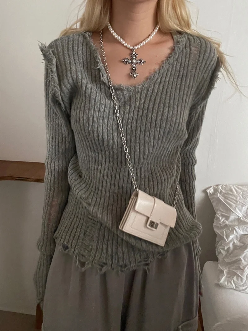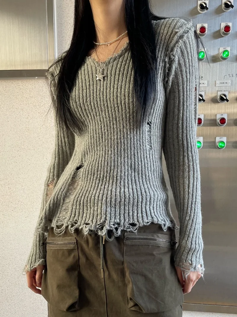 Y2k Ripped Out Sweaters V Neck Slim Full Sleeve Grunge Punk Jumpers Korean Women Cropped Pullovers Streetwear Retro