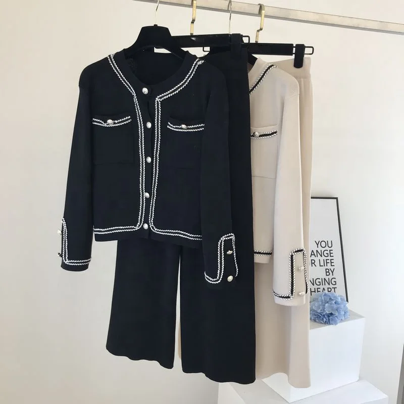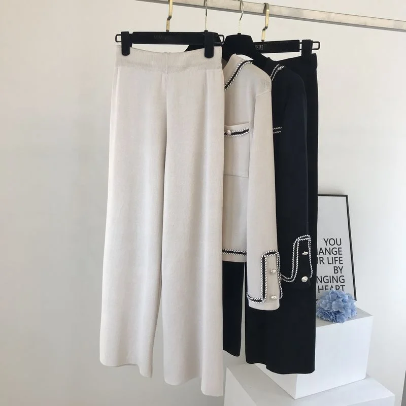 2025 New Autumn Korean Color Block Round Neck Double Pocket Knit Cardigan Top + Loose Wide Leg Pants Two-piece Pants Set Women
